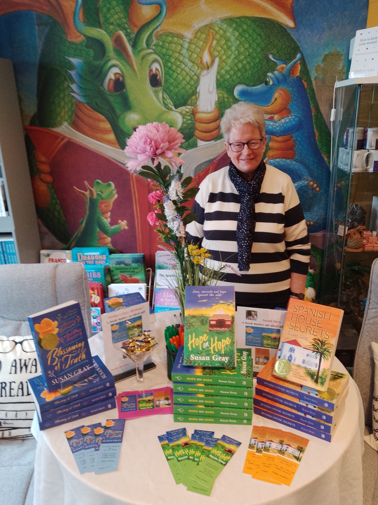 ‘Never to old to follow your dreams’ has become Susan Gray’s mantra since beginning to write novels after celebrating a significant birthday. Susan endeavours to entwine the genres of mystery and romance and sets her novels in the early Twentieth Century. She lives with her husband in northeast England, setting her books in this picturesque area. She has a son and daughter, both married, two granddaughters and a grand dog. When not writing she loves to spend time reading, puzzling, walking and catching up with friends over a coffee. She enjoys travelling and tries to include many of the places she has visited in her books. Her plots are inspired by ‘life’ and how her characters navigate the waters. She loves to ‘people watch’ and creates her characters based on the many strangers she has observed. She has written seven novels, but only three are published so far. SPANISH HOUSE SECRETS was her debut novel. HOPE ON HOPE is the sequel to BLOSSOMING OF TRUTH.